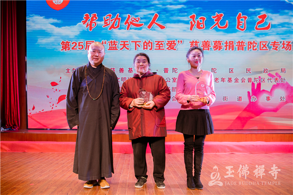 1月10日下午,上海市慈善基金会第二十五届“蓝天下的至爱”大型慈善募捐活动——普陀专场在晋元中学音乐厅举行,中国佛教协会副会长、上海市慈善基金会副理事长、上海觉群文教基金会理事长、本寺方丈觉醒大和尚应邀出席活动并带头捐款。