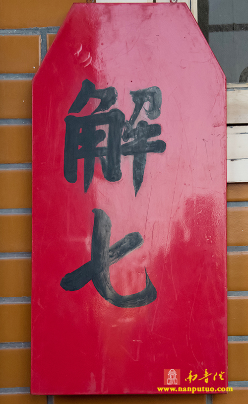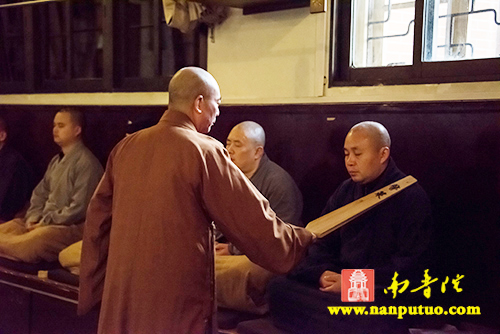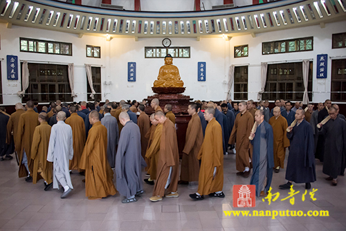 当天上午,在行完精进禅修的最后一支香后,大众分东西单八字排班站立,静候解七。南普陀寺书记净祥法师举解七牌进堂传与维那师,悦众师代众恭请南普陀寺首座了法法师主法解七。