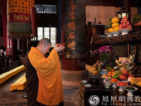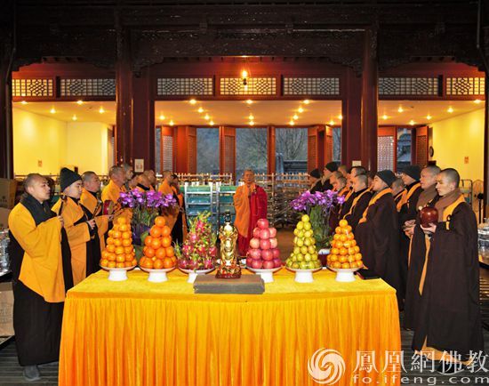 第一碗腊八粥在大雄宝殿供佛(图片来源:凤凰网佛教 摄影:灵隐寺)