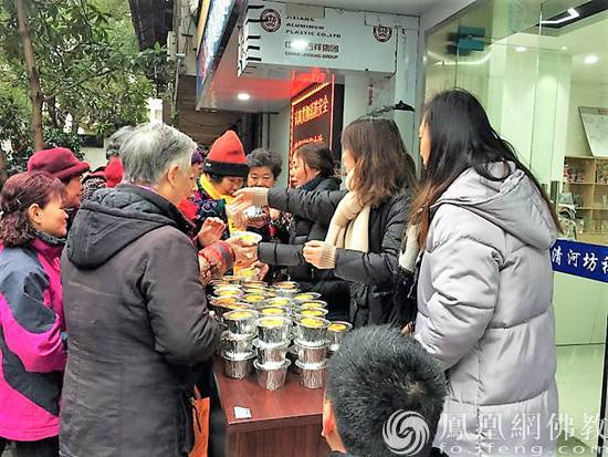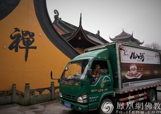 第一批腊八粥开始向外发送(图片来源:凤凰网佛教 摄影:灵隐寺)