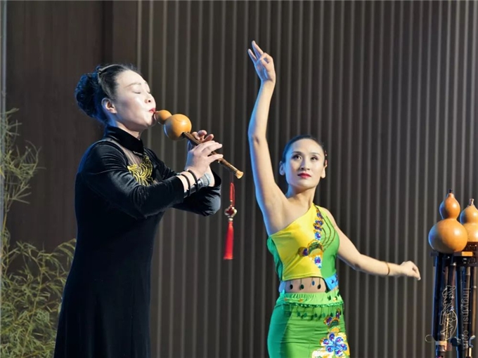 ▲葫芦丝双人演奏、伴舞《月光下的凤尾竹》·周二精进组
