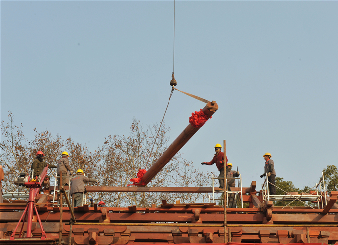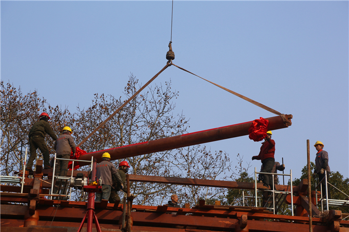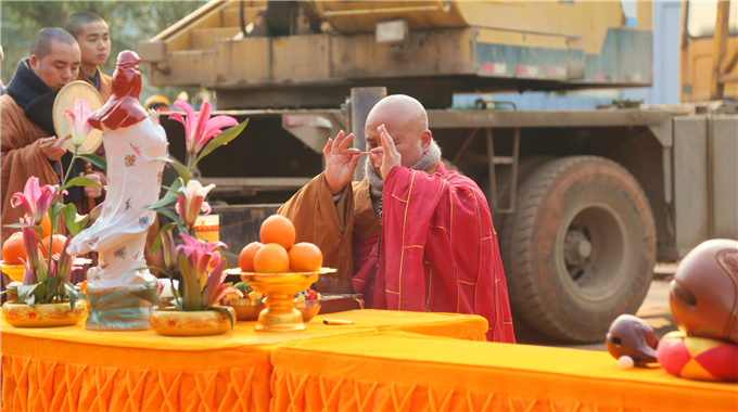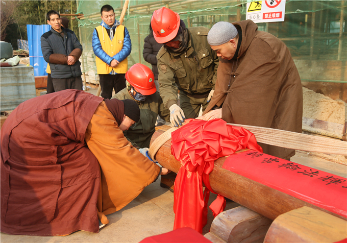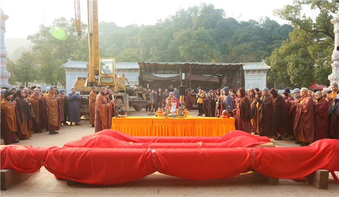 诵毕,本通法师宣上梁法语,法师语道:“金梁高立如山耸,龙象辈出法界弘。今仗三宝神威力,光前裕后绍先宗。”法师一声高喝“升!”,似可喝断烦恼的音声,令法会达到了高潮。旁边的大吊车迅速起吊起主梁,现场的出家师父与居士无不欢喜合掌,注目瞻仰,直到其稳稳当当地架于梁座之上。