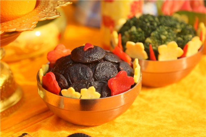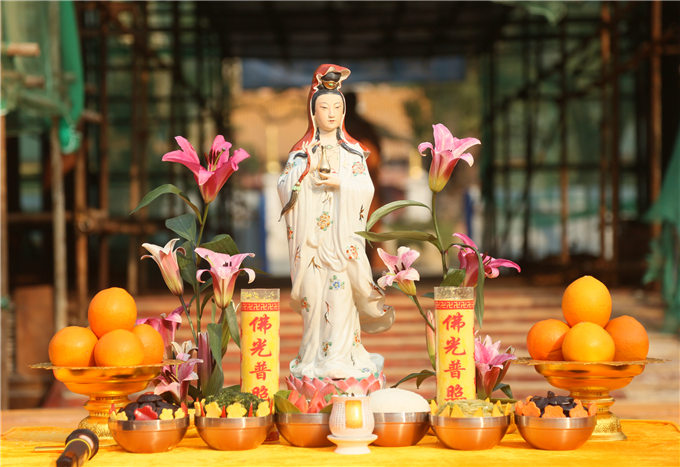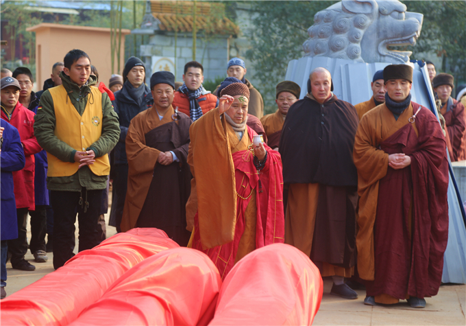 是日上午8时,正山门外早已香云弥漫,海众咸集。山门前摆放由红绸裹起来的三根大梁,前方的供桌上供奉庄严的观世音菩萨像,菩萨像前又供精美的五色香饭。两序大众及护法居士在寒风中端严肃立,静待法会开始。