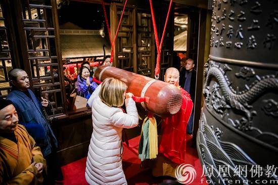 晚会结束后,上海玉佛禅寺照例举行了传统的撞钟迎新仪式(图片来源:凤凰网佛教 摄影:上海玉佛禅寺)