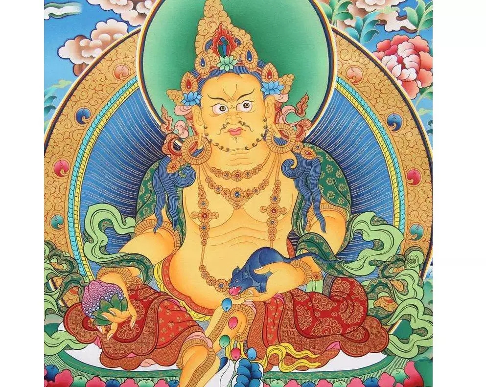 佛经中有记载北方多闻天王(毗沙门天)具有财神的功能属性,亦称“财宝天王”,在藏传佛教中习称其为“黄财神”。黄财神为财众部之首领,掌无尽宝库,修此法者,可消灭六道穷苦,增长福德、寿命、智慧, 以及一切物质与精神上的受用,心灵上得到满足。