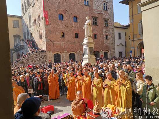 雪窦山僧团于普拉斯市政厅广场唱诵梵呗(图片来源:凤凰网佛教 摄影:小丹)
