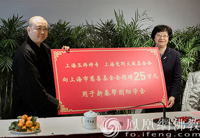 上海玉佛禅寺、上海觉群文教基金会向上海市慈善基金会捐赠25万元(图片来源:凤凰网佛教 摄影:上海玉佛寺)