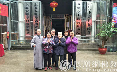 当地老人在双峰寺生命关怀中心门前欢喜合影(图片来源:凤凰网佛教 摄影:上栗双峰寺)