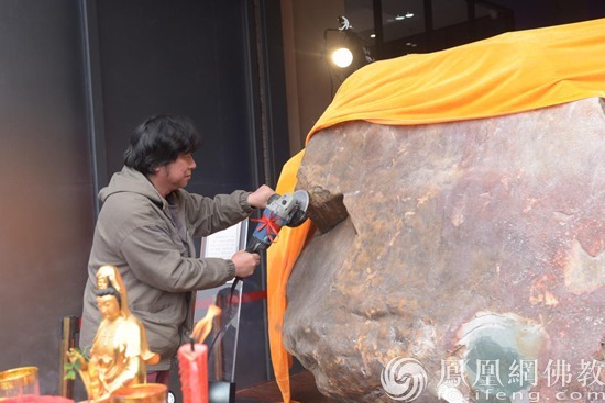 中国美术家协会会员、国家高级工艺美术师、工艺美术大师赵敏雕刻第一刀(图片来源:凤凰网佛教)