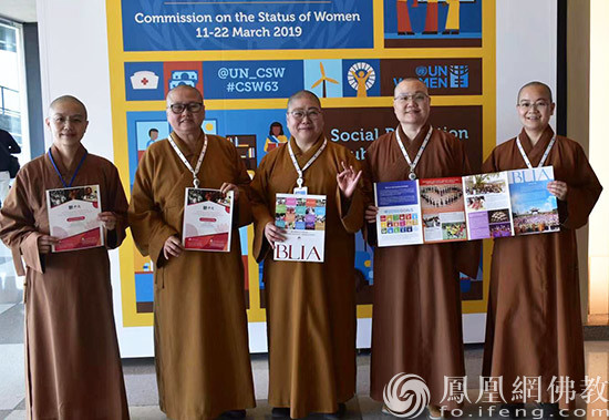 参与第63届联合国妇女地位委会平行会议的佛光山比丘尼,左起为妙净法师、觉诚法师、永固法师、有望法师和有宗法师。(图片来源:凤凰网佛教)