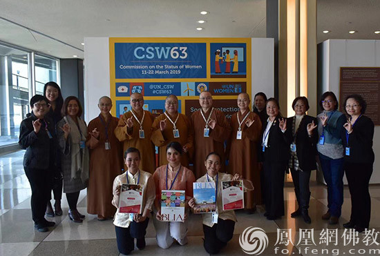 参与第63届联合国妇女地位委员会会议的佛光会代表,包括了法师、佛光人和菲律宾光明大学的师生。(图片来源:凤凰网佛教)