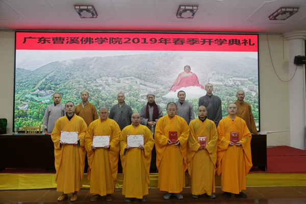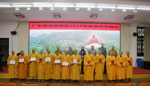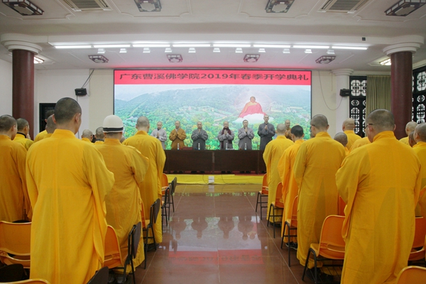 广东曹溪佛学院2019年春季开学典礼在南华禅寺多宝阁一楼举行。南华禅寺当家师、曹溪佛学院副院长法祇法师,佛学院教务长传源法师,教务主任宗岳法师,教导长观法法师等法师和全体学僧出席典礼。开学典礼由传源法师主持。