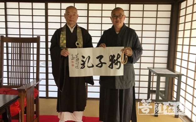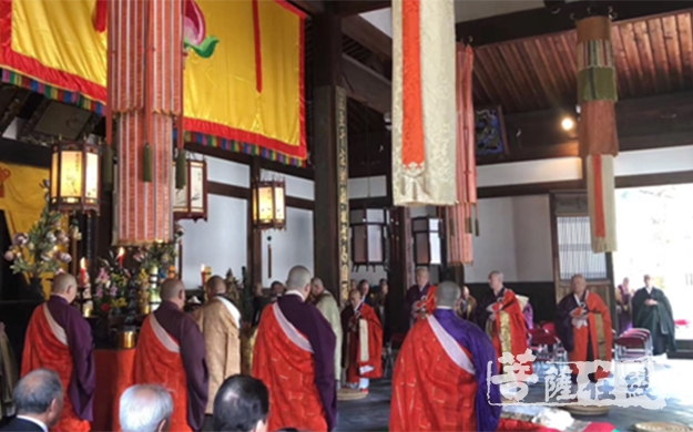 菩萨在线广东讯 4月3日,日本黄檗宗在京都万福寺举行开山祖师隐元禅师祥忌(示寂日)法会,福建古黄檗山祖庭万福寺住持戒文法师前往日本,出席隐元禅师纪念法会。日本临济宗、真言宗、曹洞宗、净土宗等派系代表参加。戒文法师与京都黄檗宗大本山近藤博道管长一同诵经拜祭隐元祖师。近藤博道管长赠送戒文法师“狮子吼”书法一幅。法会期间戒文法师就如何促进中日黄檗法脉互动互鉴与近藤博道管长、仙石部长、长崎兴福寺住持松尾法道方丈等进行交流。