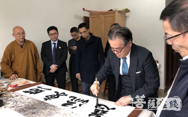 4月4日,日本驻广州总领事馆、日本国驻广州总领事石冢英树在福清副市长刘必建先生和外办、统战部、渔溪镇等领导陪同下拜访黄檗山万福禅寺,万福禅寺监院戒提法师、知客日煦法师接待来访团参观寺院,并介绍黄檗山的历史和复建等情况,同时就中日两国如何促进黄檗文化的友好关系进行交流。石冢英树表示他很喜欢黄檗山,因为黄檗山有灵气,待建好后他将来黄檗山体验几天祖庭的生活。随后石冢英树为黄檗山万福禅寺题写“慈流东照”书法,戒提监院赠送住持戒文法师墨宝“禅心印月”一副。