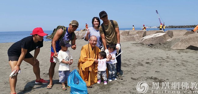 净耀法师与全家参与净滩活动的民众合影(图片来源:凤凰网佛教)