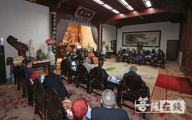 菩萨在线浙江讯 4月16日,全国政协委员、民族和宗教委员会驻会副主任、分党组副书记杨小波,全国政协委员、民族和宗教委员会驻会副主任、国家民族事务委员会原副主任罗黎明,全国政协委员、中央政法委副秘书长樊绪银等全国政协民宗委调研组一行前往普陀山来就“依法加强和创新寺观教堂管理”进行专题调研。中国佛教协会副会长、普陀山佛教协会会长、中国佛学院普陀山学院院长、普济禅寺方丈道慈大和尚接待调研组一行,并在普济禅寺方丈殿进行座谈。