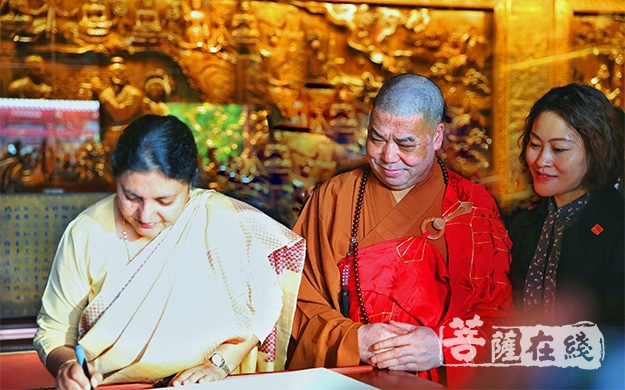 尼泊尔总统比迪娅·德维·班达里表示自尼中建交以来,一直保持着友好往来,佛教文化的广泛传播,更是进一步加深两国人民的深厚友谊,并于般若堂签名留字作为纪念,增勤大和尚回赠一尊水晶佛像以作感谢,并表示中尼两国作为友好邻邦,法缘情谊更是源远流长,晋代高僧法显及唐代三藏法师玄奘都曾作为弘法利生与文化交流的使者,游历至佛祖释迦摩尼的诞生地蓝毗尼园,也就是今尼泊尔南部。
