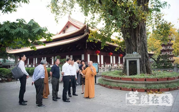 下午16时,嘉兴市调研团一行抵达光孝寺,明生大和尚带领诸位来宾参观寺内各处建筑,叙述历代祖师大德与光孝寺的历史因缘,介绍寺内历史悠久的名胜古迹等。