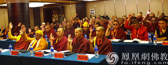 与会代表举手表决(图片来源:凤凰网佛教 摄影:明捐法师)
