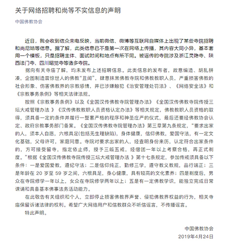 中国佛教协会关于网络招聘和尚等不实信息的声明