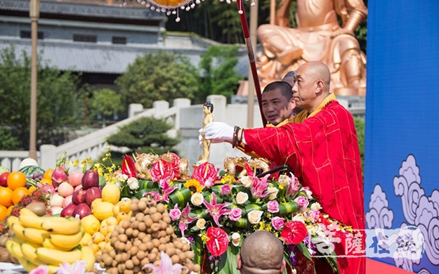 四位法师恭敬手捧释迦牟尼佛太子像,将太子圣像请至龙华广场,安奉于洒满花瓣、灌满香汤净水的九龙金盆之中,随后怡藏大和尚带领四众弟子依次为太子佛沐浴。