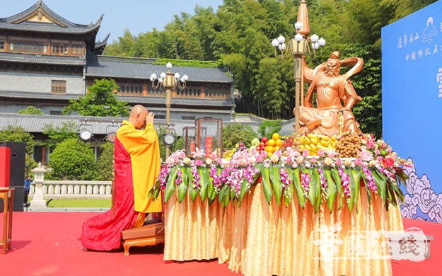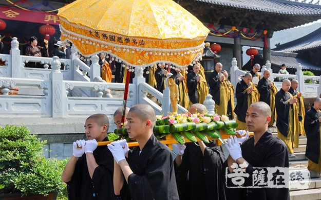 上午八时,雪窦山方丈怡藏大和尚率领两序僧众前往大慈摩尼之殿,迎请太子像至龙华广场,举行浴佛祈福法会。