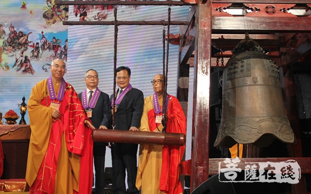 主礼嘉宾鸣吉祥钟(左起:宽运法师、刘江华局长、陈冬副主任、智慧长老)