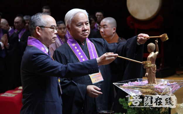 浴佛大典于5月12日下午15时举行,近八千市民出席。香港佛教联合会荣誉会长智慧长老、香港佛教联合会会长宽运法师、中央政府驻港联络办公室副主任陈冬、香港特别行政区民政事务局局长刘江华为大会担任主礼嘉宾,一同鸣吉祥钟祝愿佛光普照、风调雨顺、香港祥和。