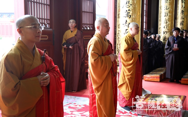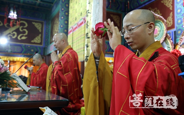 5月3日上午8时,正授菩萨戒,恭请青岛市佛教协会副秘书长、胶州市佛教协会会长、胶州慈云寺方丈、湛山堂上了善律师为得戒大和尚;青岛市佛教协会副会长、黄岛灵珠山菩提寺住持、真如堂上妙智律师为羯磨阿阇梨;青岛市佛教协会副秘书长、黄岛大珠山石门寺住持、隆昌堂上法航律师为教授阿阇黎。三师拈香礼佛登法座,法相庄严,威仪具足。