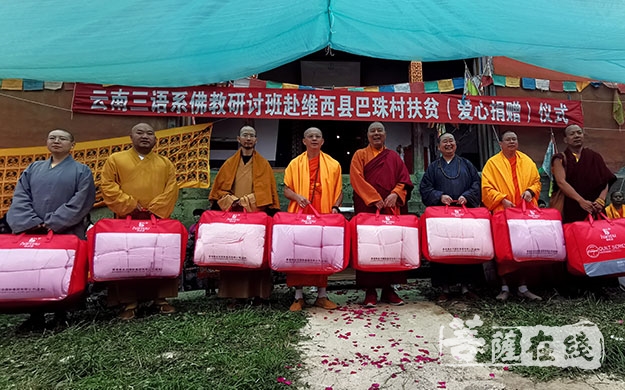 为弘扬佛教慈悲济世精神,三大语系佛教研讨班僧众,带着吉祥祝福,带着慈悲关爱,于24日上午前往巴珠村进行扶贫(爱心捐赠)慈善公益布施活动。此次活动共向巴珠村120余位贫困老人每人捐赠棉被1床及现金100元和一些常规药品。供养寺庙僧人8500元,捐款22700元用于寺院建设及巴珠村扶贫工作。