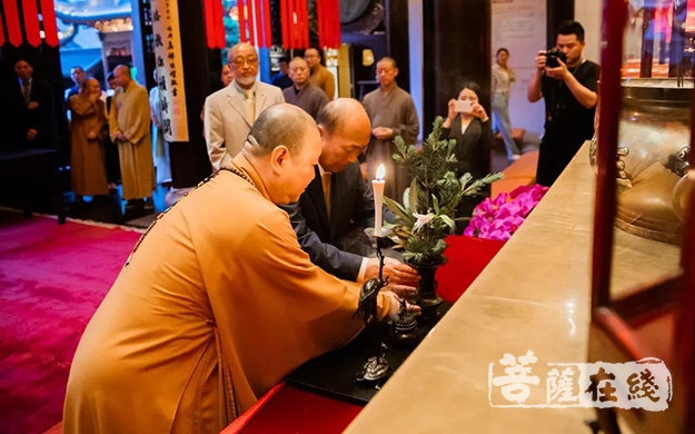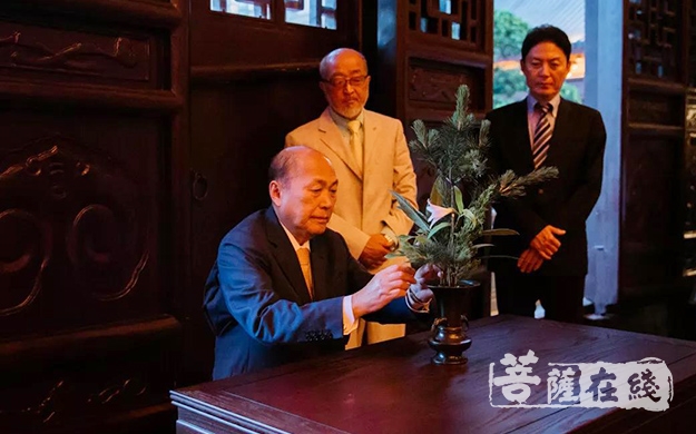 傍晚时分,池坊专永家元与觉醒大和尚一同步入大雄宝殿供花礼佛。佛前供花仪式十分庄严,池坊专永家元仔细地检查供花的材料与花材所呈现出来的姿态,并与觉醒大和尚一起将插好的鲜花虔诚地供奉于佛前。
