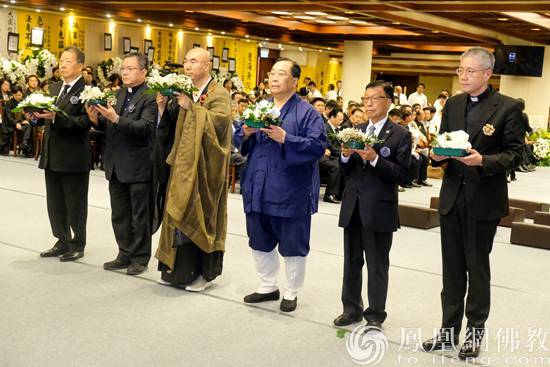 宽运法师(左三)及香港各宗教领袖献花致祭(图片来源:凤凰网佛教 摄影:香港宝莲禅寺)