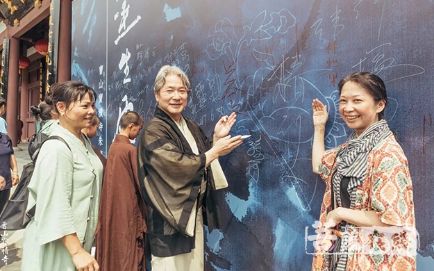 6月29日,来自中、日、韩三国的艺术家,曹山宝积寺住持养立法师,以及禅意书画展作者朱德玲共同为展览剪彩。朱德玲在展板前欣然挥毫,并与艺术家合影留念。