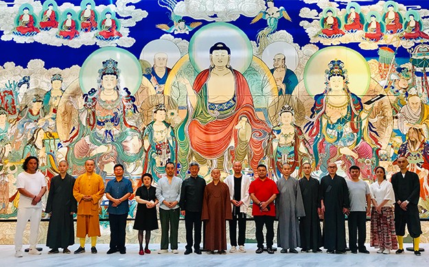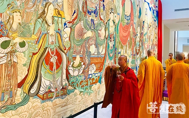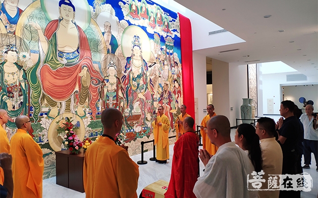 菩萨在线浙江讯 8月26日,上海龙现代艺术馆举行“重彩大乘”雪窦山《弥勒说法图》迎请仪式。浙江佛学院雪窦山弥勒佛学院副院长、雪窦山华林讲寺、水涧岩精舍监院然相法师主持法会。《弥勒说法图》绘制者战乃明、王春霞居士及众护法居士参加本次法会。