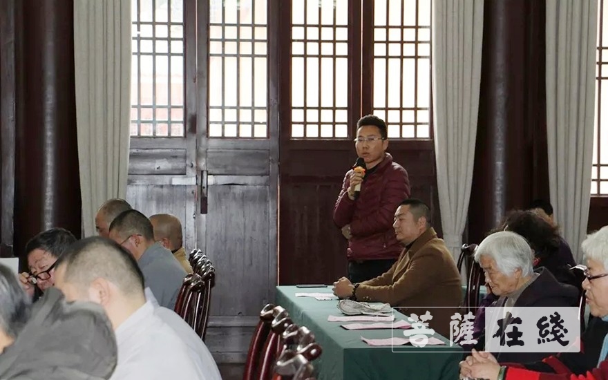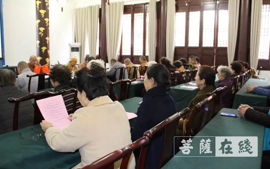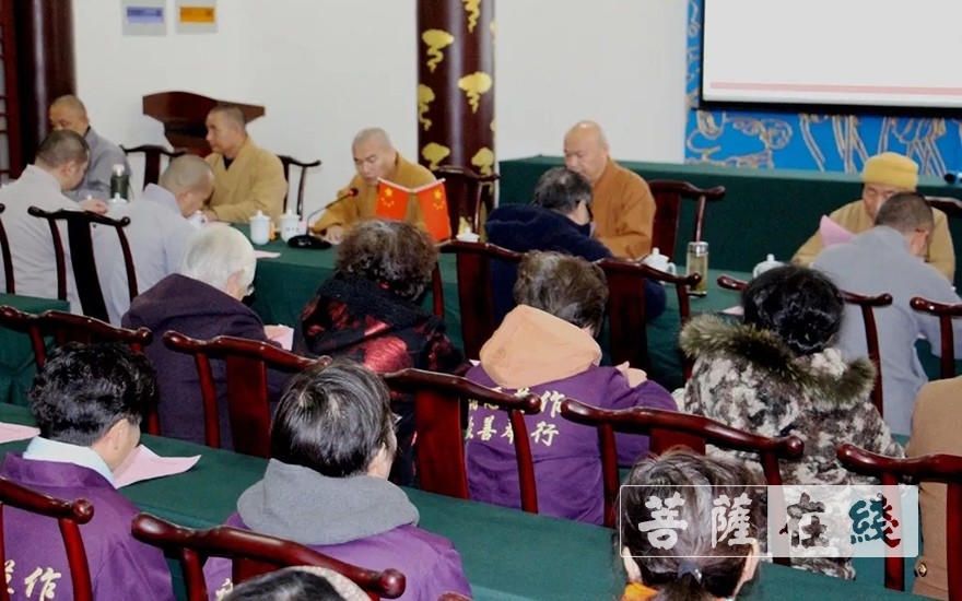 菩萨在线江苏讯 11月25日上午,淮安市佛教协会在慈云禅寺讲经堂召开了法师和居士学习贯彻党的十九届四中全会精神扩大会议。会议由淮安市佛教协会会长、慈云禅寺方丈果光大和尚主持,淮安市佛协秘书长道宽法师、副秘书长康长文等参加会议。淮安市民宗局副局长孙建龙应邀参加,并带领全体参会人员学习了《中国共产党第十九届中央委员会第四次全体会议公报》、公报关键词等会议内容和精神。