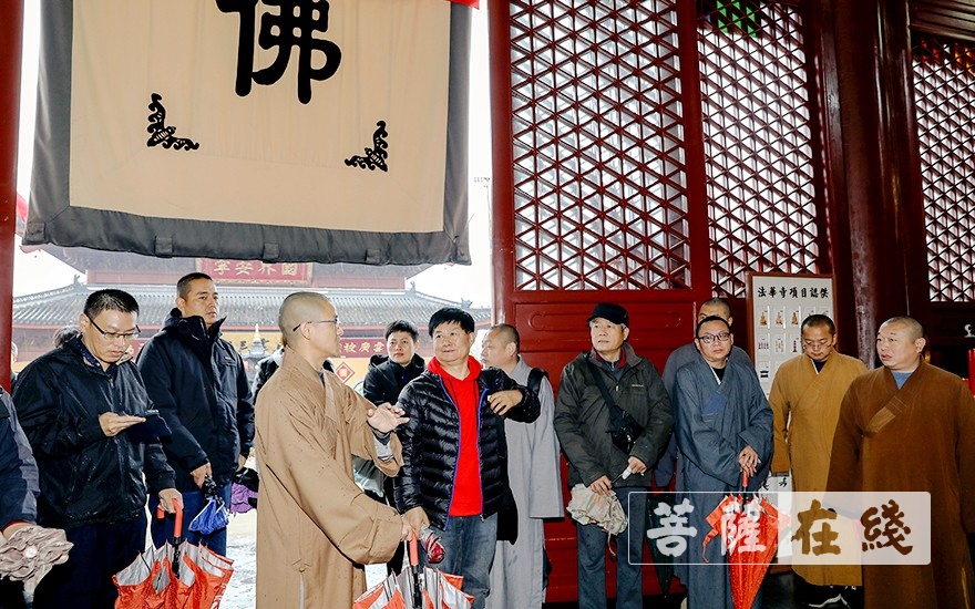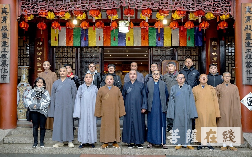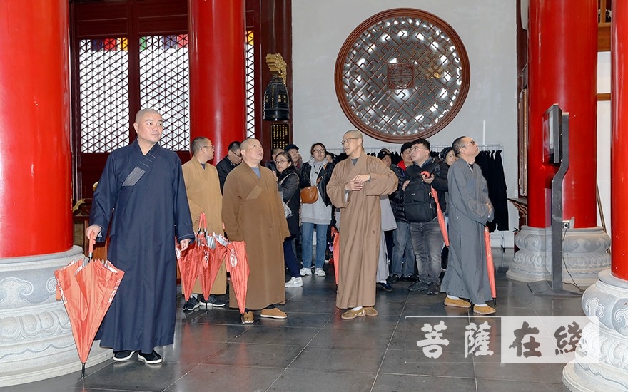菩萨在线江苏讯 11月25日,江苏省佛教协会副秘书长、无锡市佛教协会副会长、无锡惠山寺方丈玉平法师一行14人在湖州市佛教协会会长慈满法师、湖州市佛教协会办公室主任宗然法师的陪同下赴法华寺交流场所管理经验。下午13时许,因法华寺住持印可法师出门在外,由法华寺堂主证悟法师与维那印宣法师率众热情接待。