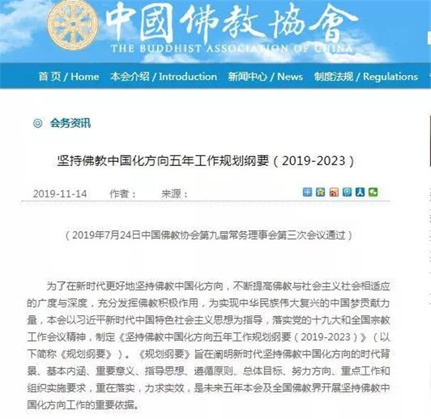 中国佛教协会发布《坚持佛教中国化方向五年工作规划纲要(2019-2023)》