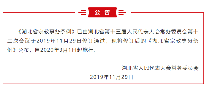 湖北省宗教事务条例》公布,自2020年3月1日起施行