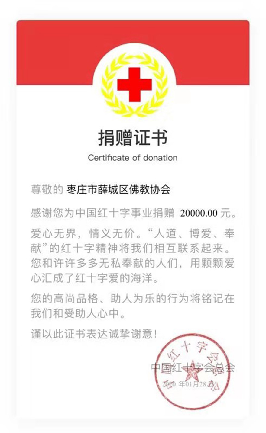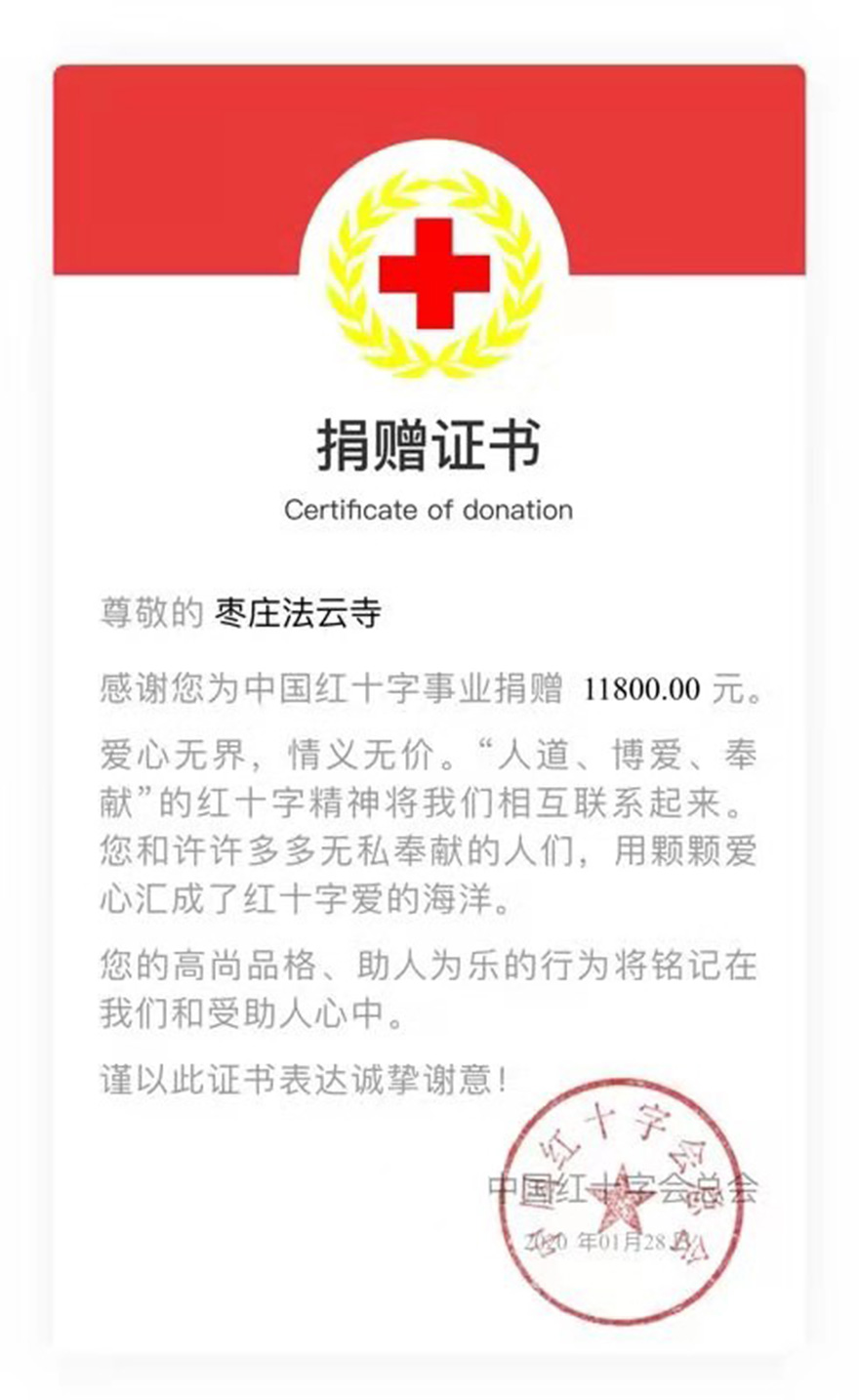 二、号召枣庄市佛教界四众弟子及社会各界人士积极为抗击疫情募捐善款。在市佛协倡导下,各区、市佛教协会和佛教寺院,积极宣传倡导佛弟子及爱心人士奉献爱心,捐款、捐物共同助力疫情防控工作。