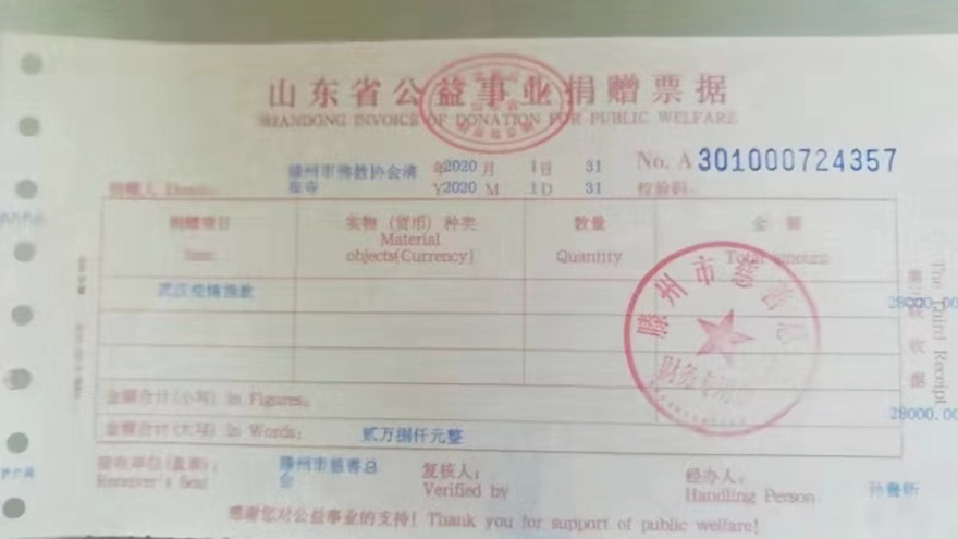 菩萨在线山东讯 为深入学习贯彻习近平总书记对新型冠状病毒感染的肺炎疫情作出的重要指示批示精神,坚决打赢新型冠状病毒感染的肺炎疫情这场防控硬仗。枣庄市佛教协会发扬佛教“慈悲济世、利益众生”的优良传统,积极响应山东省、市统战部、宗教局倡议,在山东省佛教协协会的指导下,并向枣庄市各区、市佛教协会及宗教场所发出倡议,号召佛教界四众弟子积极为抗击疫情募捐善款三十六万余元。