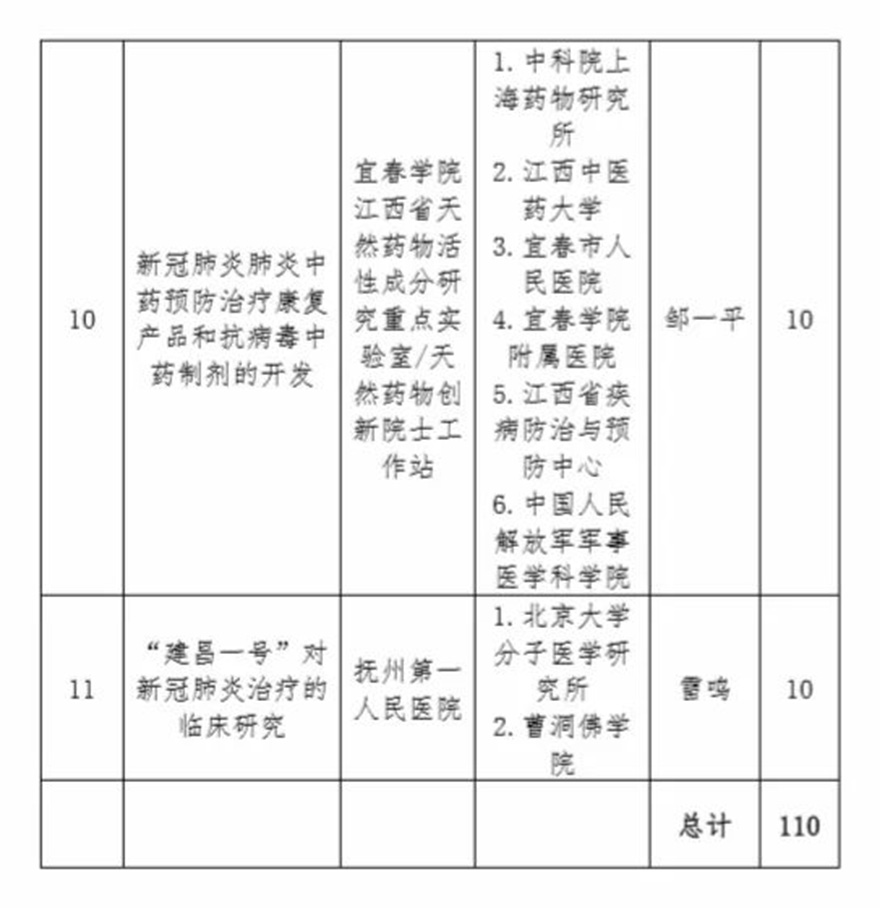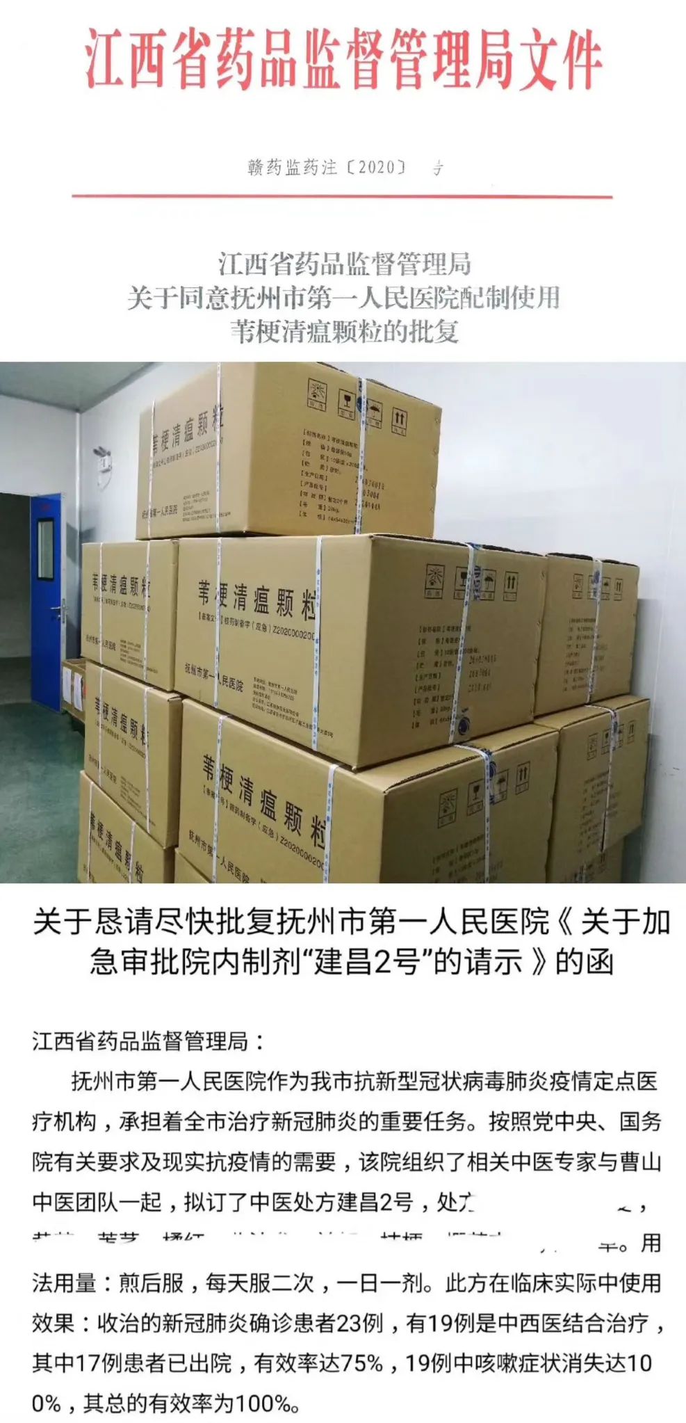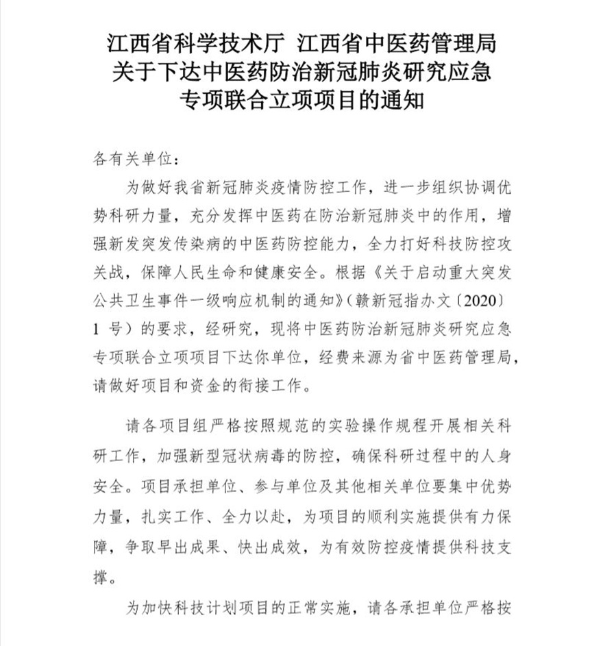 曹山中医团队负责的《“建昌一号”对新冠肺炎治疗的临床研究》,经由江西省科学技术厅、江西省中医药管理局联合下发《关于下达中医药防治新冠肺炎研究应急专项联合立项项目通知》公示,获得立项。