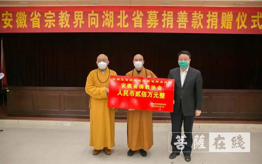 安徽省佛教协会按照省委、省政府、省委统战部、省宗教局的部署和要求,向全省佛教界发出了《关于号召全省佛教界为抗击新型冠状病毒感染的肺炎疫情募捐的倡议书》。“一方有难,八方支援”,安徽省佛教界发挥宗教乐善好施、扶危济困的优良传统,勇于担当,结合自身实际,各尽所能,为抗击疫情奉献爱心,为打赢疫情防控阻击战贡献力量。