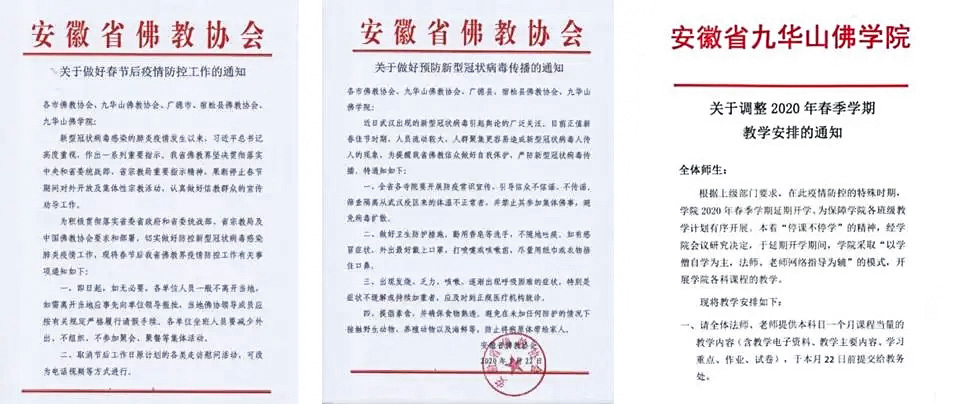 1月23日,武汉封路,全国疫情防控全面升级,安徽省佛教协会迅速行动,按照省委、省政府要求,先后下发《关于做好预防新型冠状病毒传播的通知》《关于做好春节期间和节后疫情防控工作的通知》,及时转发中国佛教协会《关于疫情期间停止相关活动的通知》等,同时通过微信、QQ群等网络平台,部署各地佛教协会、寺院、九华山佛学院认真学习贯彻习近平总书记重要指示和中共中央印发的《关于加强党的领导、为打赢疫情防控阻击战提供坚强政治保证的通知》精神,切实提高政治站位,树牢打赢新型冠状病毒感染肺炎阻击战的信心和决心,积极协助党和政府坚决打赢疫情防控阻击战。