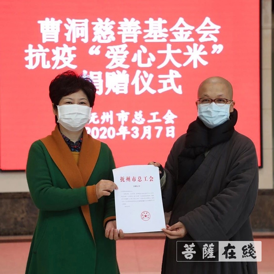 抚州市总工会主席江玉兰代表一线工作人员接受捐赠,养立法师代表基金会接过捐赠证明。