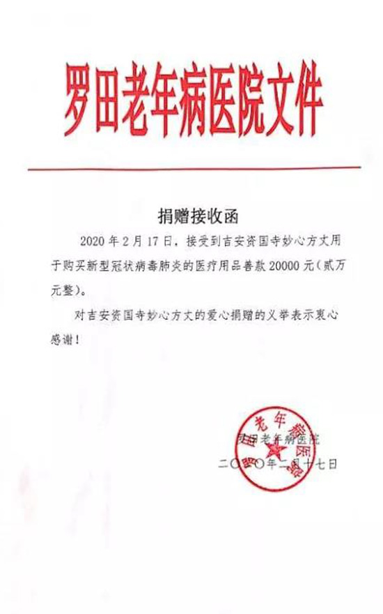 妙心法师直接捐助20000元现金,用于疫情防控。正是因为有党和政府亲切关怀,全国人民心连心、手牵手,众志成城,取得了疫情防控的胜利,让山河无恙,迎来了春花灿烂的阳春三月。