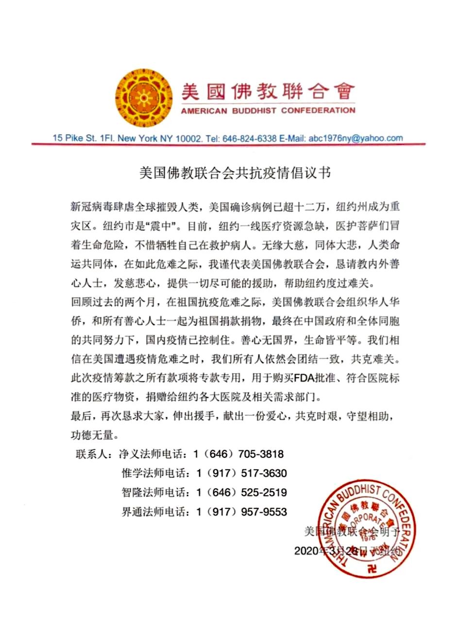 目前处于疫情“震中”的纽约,一线医疗资源急缺,医护人员们冒着生命危险,不惜牺牲自己救护病人。在危难之际,美国佛教联合会会长明予法师,发出共抗疫情倡议书,恳请教内外善心人士,发慈悲心,提供一切尽可能的援助,帮助纽约度过难关。