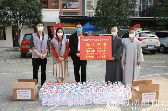 桂平市西山龙华古寺捐赠消毒酒精给桂平市民政局。(图片来源:风凰网佛教 摄影:张满常)