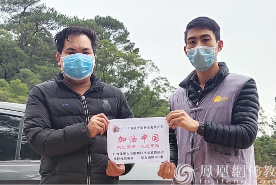 桂平西山龙华古寺给桂平市道教协会捐赠防疫物资。(图片来源:风凰网佛教 摄影:农荣耀)