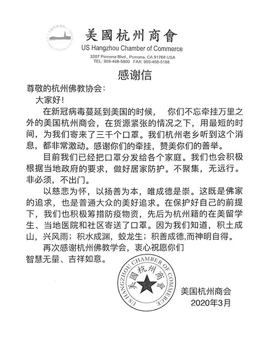 杭州市佛协还相继为美国、英国、澳大利亚等国的华人华侨捐送口罩20000多个,另有灵隐寺向日本捐赠抗疫善款10万元人民币。英国浙江联谊会、澳大利亚浙江侨团联合会等相继发来感谢信,感谢杭州佛教界万里驰骋的守望相助。