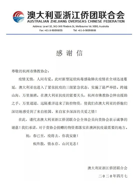 澳大利亚浙江侨团联合会感谢信